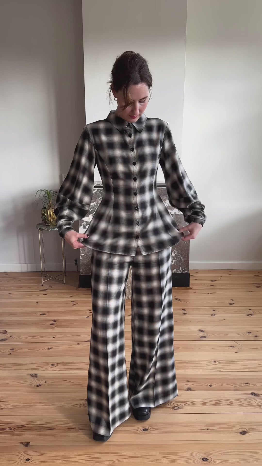 The Amelia trousers in plaid are the perfect wide leg trousers with a mid rise and deep front pockets. Made from a deadstock lightweight plaid fabric. The trousers are matched with the Gloria blouse.